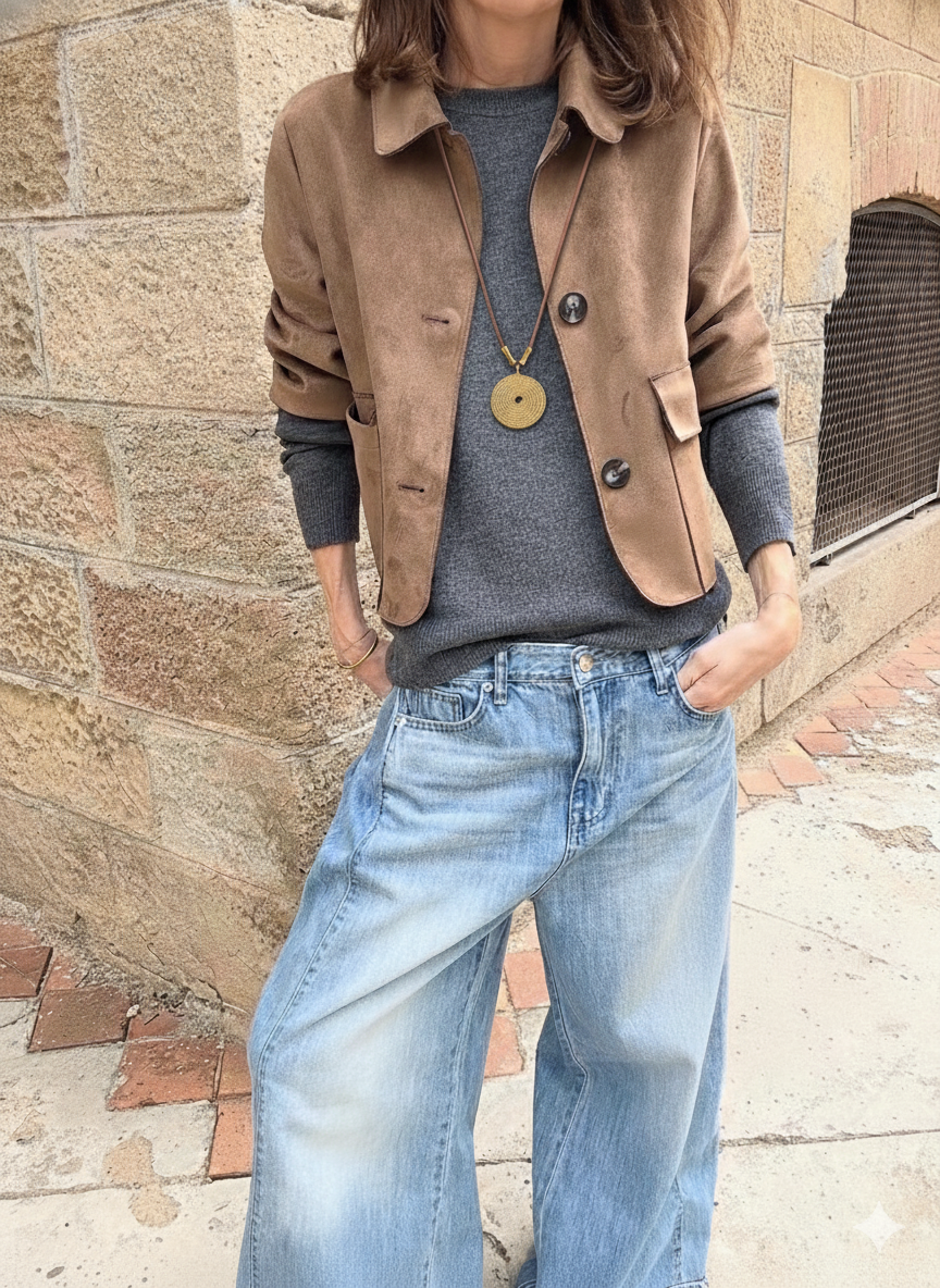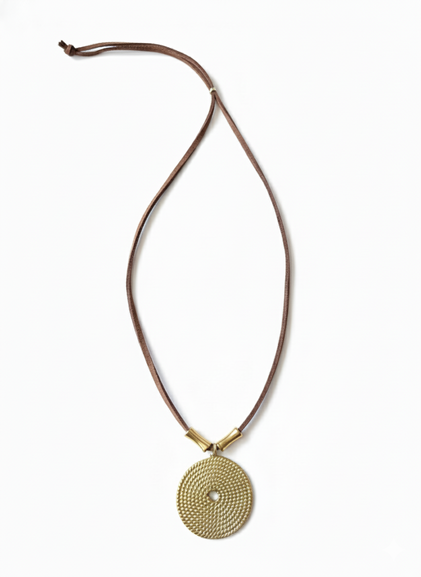Nara es una pieza con esencia natural y carácter suave. El cordón de ante aporta textura y calidez, mientras el colgante redondo dorado añade un punto de luz elegante y sutil. Su diseño limpio y versátil permite combinarlo fácilmente con otras piezas o llevarlo como detalle protagonista.